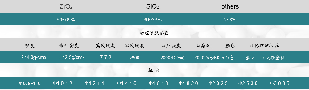 采用滾動成型工藝、通過高溫?zé)Y(jié)制成,珠子內(nèi)部硅酸鋯微粒均勻致密,密度和硬度適中,適合中低黏度物料的研磨和分散,可匹配大部分市面上的砂磨機(jī)。